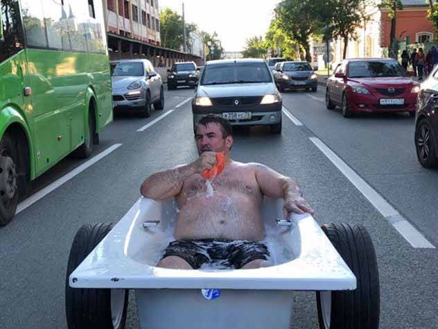Житель Тюмени Эдуард около часа катался по городу в ванне. Фото он разместил у себя в «ВКонтакте», сообщили российские СМИ.