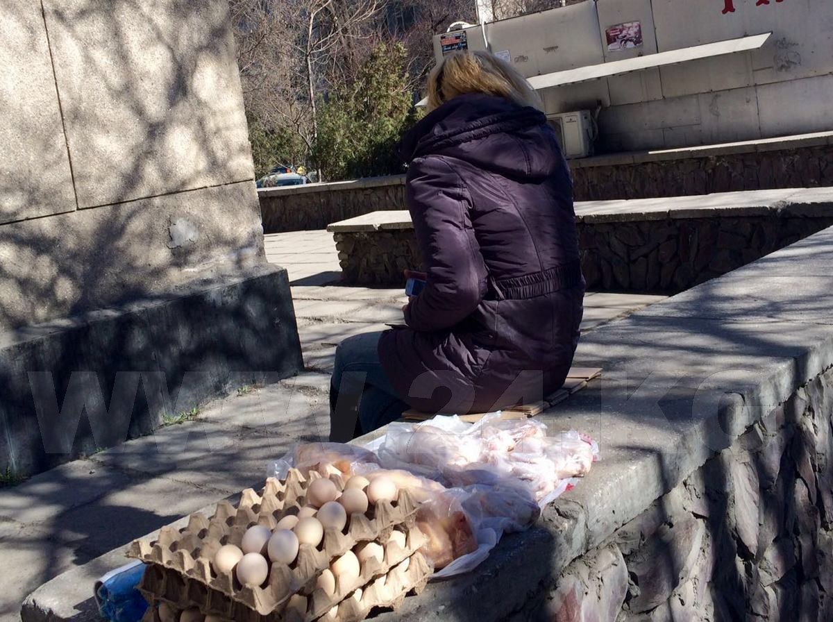 В центре Бишкека на улице Боконбаева девушка продает кур и яйца, на улице Усенбаева покупателям предлагают свинину и булочки. К слову, температура воздуха в этот день составляла 21 градус тепла. Естественно, холодильников у продавцов нет и в помине, как нет патента, а тем более санитарных книжек. Можно даже не сомневаться. Поэтому спрашивать с них, каково происхождение продуктов, бесполезно.