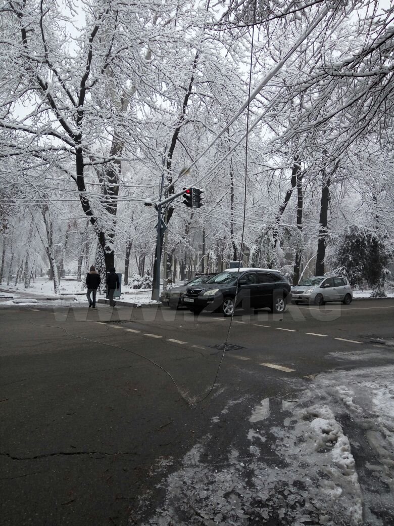 Следует отметить, что на пересечении улиц Тыныстанова и Фрунзе оборван провод линии электропередачи. Здесь же повалено несколько деревьев, перегородив проход по тротуару.