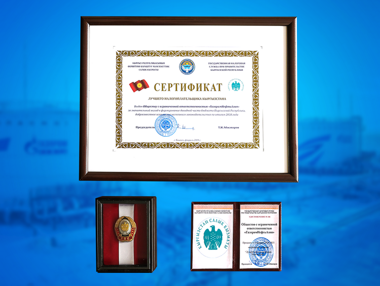 8 февраля Государственная налоговая служба при правительстве Кыргызской Республики вручила ОсОО «Газпром нефть Азия» сертификат «Лучший налогоплательщик Кыргызстана» за значительный вклад в формирование доходной части бюджета республики, добросовестное исполнение налогового законодательства по итогам 2018 года.