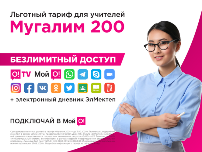 Если весной вы уже пользовались тарифом «МУГАЛИМ 200» или ваш номер телефона зарегистрирован в системе «ЭлМектеп» в качестве учителя, тогда для подключения к новому тарифу достаточно набрать команду *155*76#.