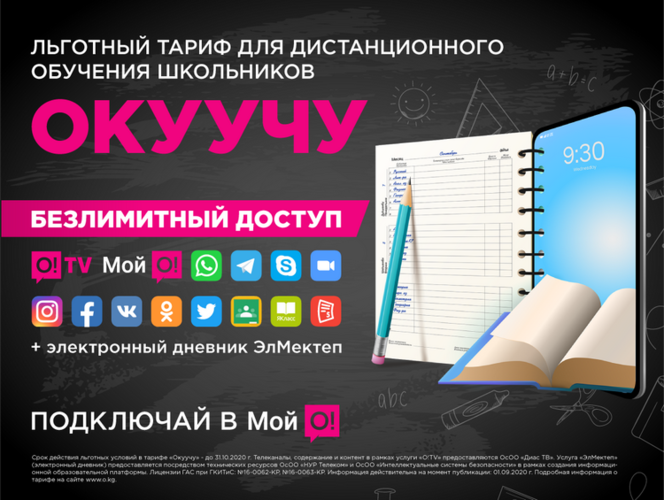 Школьные тарифы «Окуучу», «Мугалим 200» и студенческий тариф «Переходи на О! Студент Онлайн» имеют льготную стоимость, которая существенно ниже рыночной. Все, что нужно для обучения, в них есть: