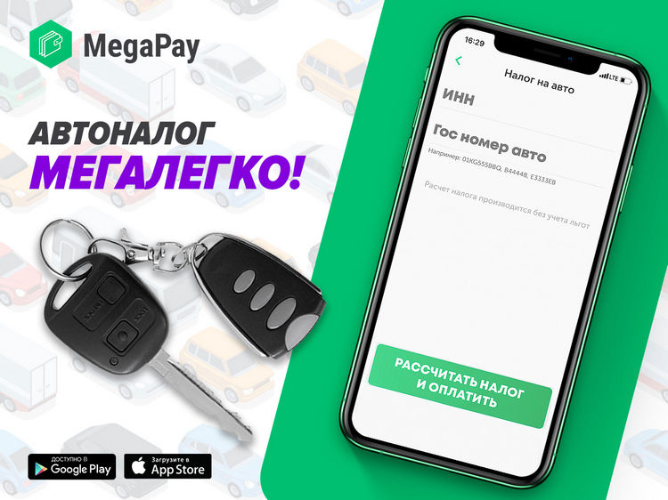 Оплатите налог на транспортное средство через мобильный кошелек MegaPay (доступен для скачивания в Google Play и App Store).