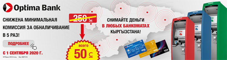 «Оптима Банк» рад сообщить, что с 1 сентября 2020 года для держателей карт Visa от «Оптима Банка» снижена минимальная комиссия за обналичивание средств в банкоматах сторонних банков Кыргызской Республики в 5 раз.
