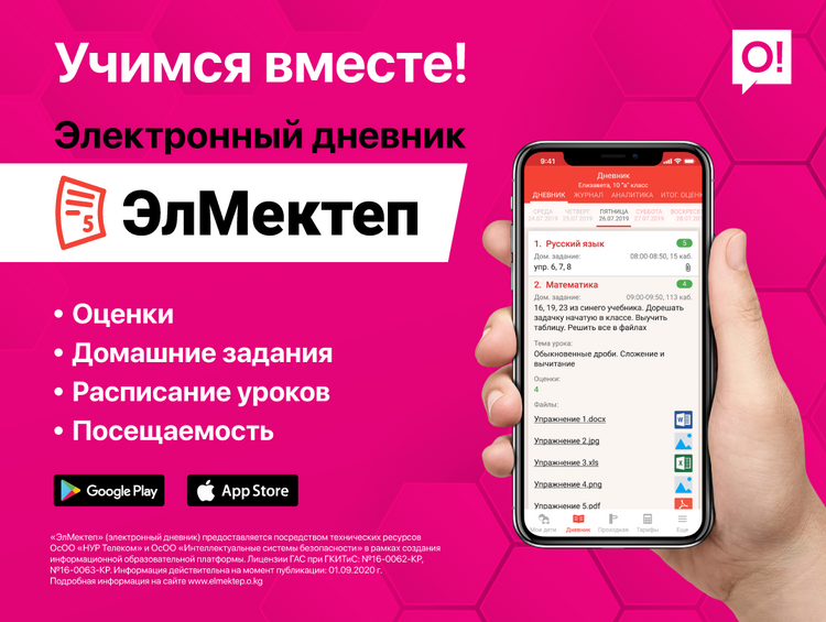 1 сентября к новому учебному году Мобильный оператор О! совместно с ОсОО «Интеллектуальные системы безопасности» запустил новую услугу «ЭлМектеп» — электронный дневник для школьников и их родителей.