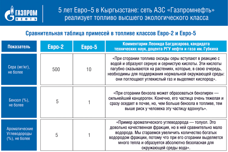 Сеть АЗС «Газпромнефть» в 2015 году стала первой сетью в Кыргызстане, которая начала продавать автолюбителям сжиженный газ, бензин и дизель исключительно класса «Евро-5».