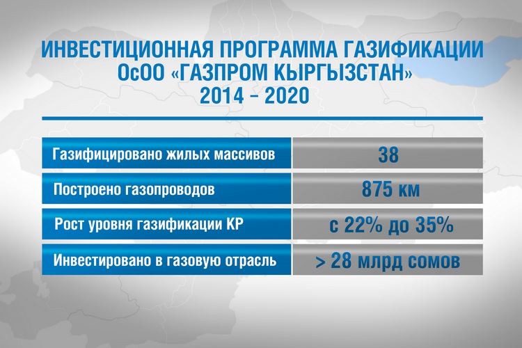 Общая сумма инвестиций компании «Газпром Кыргызстан» в проекты газификации 2020 года составила 1 миллиард 400 миллионов сомов.