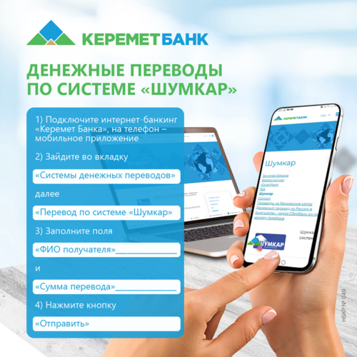 Вы клиент «Керемет Банка», и вам необходимо срочно отправить деньги родным, близким или друзьям, живущим в Кыргызстане? «Керемет Банк» предлагает максимально удобное и простое решение — мгновенные переводы «Шумкар» через мобильный или интернет-банкинг в любую область страны по минимальной комиссии.