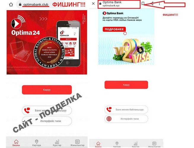 «Оптима Банк» сообщает, что в интернете появились фишинговые (поддельные) сайты с рекламой о розыгрыше 12 тысяч сомов каждому клиенту «Оптима Банка» за авторизацию в мобильном приложении «Оптима24». При этом поддельные страницы содержат логотип банка и «Оптима24» и визуально повторяют реальные страницы с целью вызвать доверие жертв мошенничества.