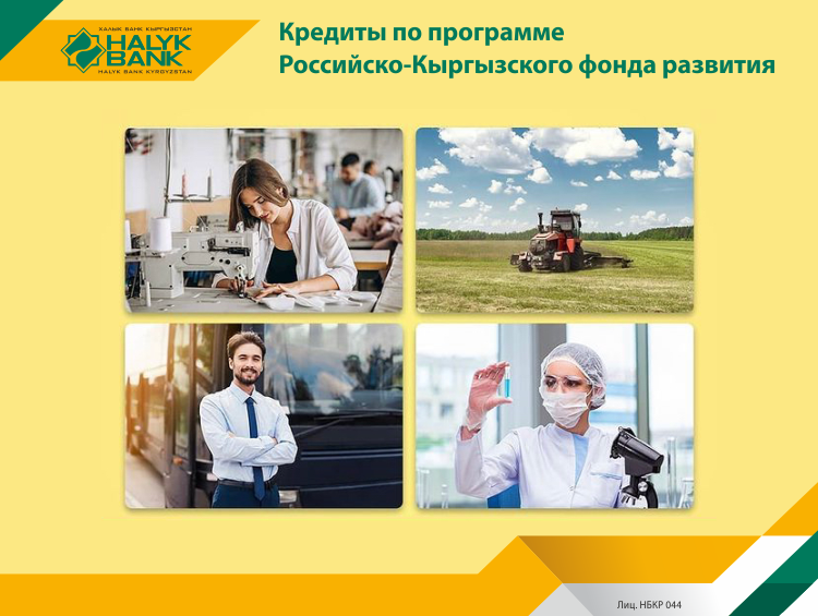 ОАО «Халык Банк Кыргызстан» уже более пяти лет успешно сотрудничает с Российско-Кыргызским фондом развития. Совместная кредитная линия специально создана для поддержки бизнес-сегмента с упором на те отрасли, которые особенно необходимы для развития нашей страны. Процентная ставка от 9 процентов годовых в сомах и от 5 процентов годовых в долларах США.
