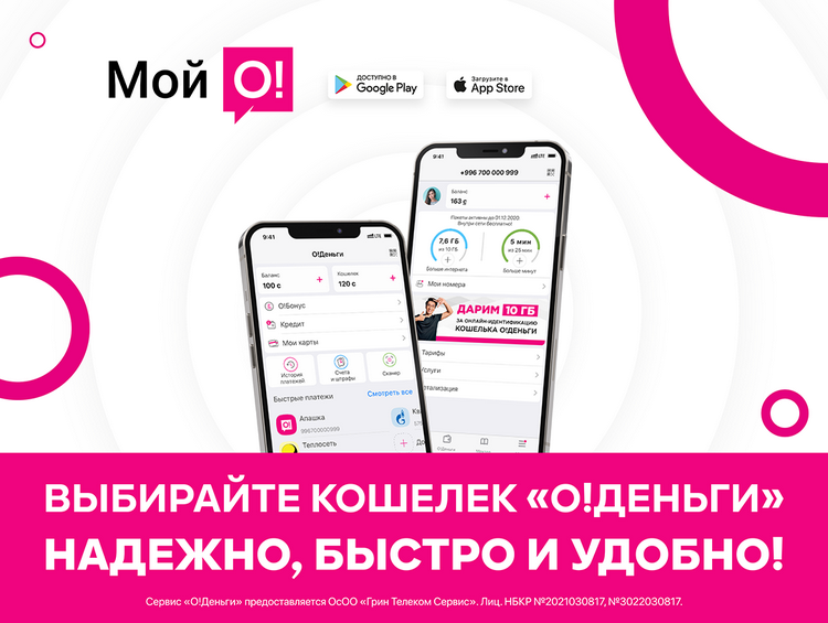 Сервис «О!Деньги» предоставляется ОсОО «Грин Телеком Сервис». Лицензия НБ КР № 2021030817, № 3022030817.