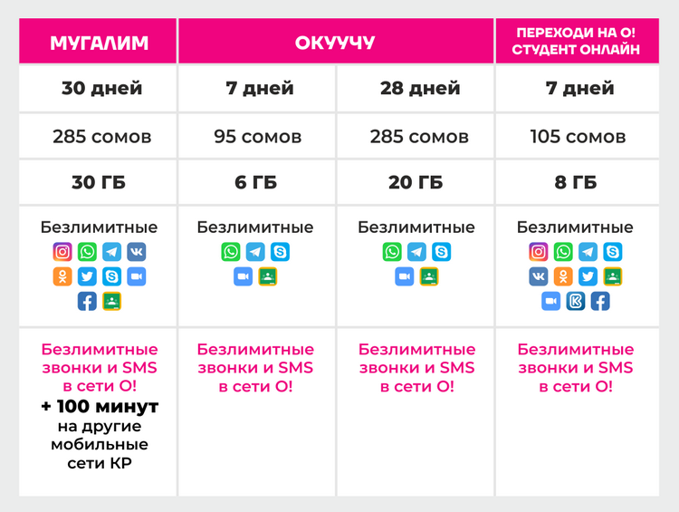 Тарифные планы «Мугалим», «Окуучу» и «Переходи на О! Студент Онлайн» значительно выгоднее обычных. Каждый из них адресно нацелен на свою аудиторию и включает разные «фишки», но общее у них одно — в них есть все необходимое не только для учебы и обучения, но и для общения: