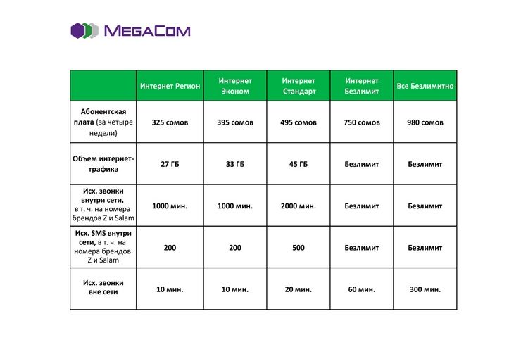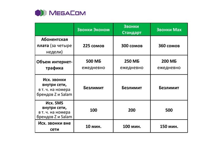 Подробную информацию по условиям подключения тарифных планов «Интернет» и «Звонки» читайте на официальном сайте компании MegaCom.