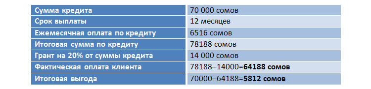 Например, за газовый котел и установку нужно заплатить 70 тысяч сомов. По кредиту с учетом процентов пришлось бы заплатить 78 тысяч 188 сомов. Одобренный грант позволит сэкономить 20 процентов от 70 тысяч — 14 тысяч сомов. В итоге вы заплатите даже меньше, чем сумма кредита, — 64 тысячи 188, а не 70 тысяч сомов. И сможете разбить сумму на 12 месяцев.
