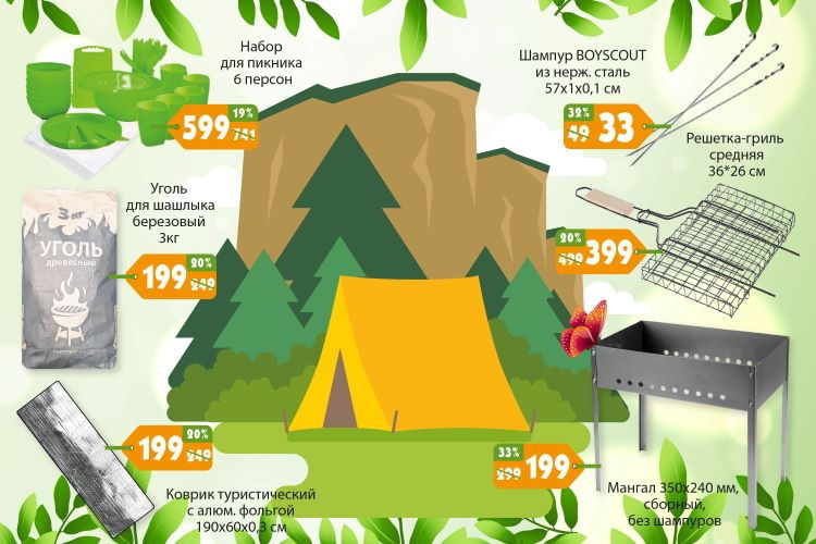 В магазинах сети к тому же есть все для приготовления этого популярного блюда, начиная от наборов для пикника и заканчивая мангалом. На эти и другие товары действуют скидки. К примеру, на шампуры из нержавеющей стали по каталогу скидка от начальной цены составит 32 процента. Решетка-гриль обойдется в 399 сомов (на 100 сомов дешевле), а сборный мангал — всего в 199 сомов (скидка 33 процента).
