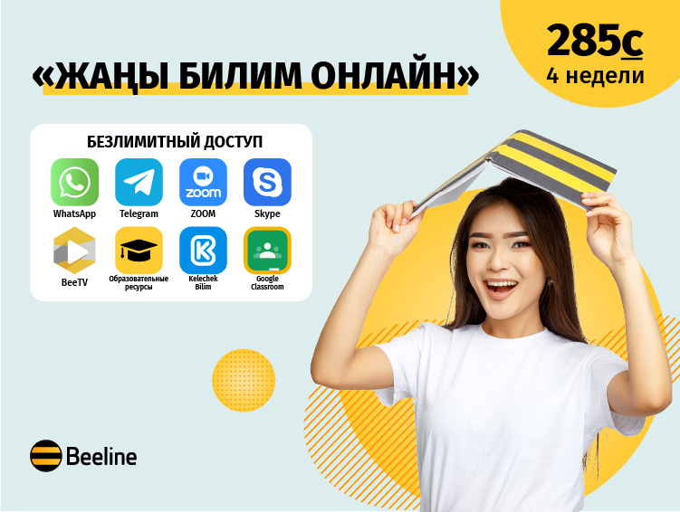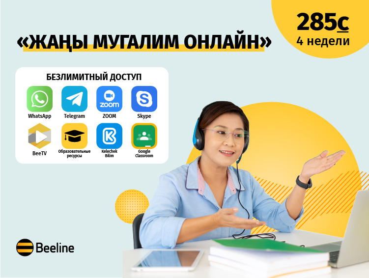 Beeline продолжает активную работу на рынке дистанционного образования и подготовил для учеников и студентов обновленную линейку тарифных планов «Жаңы Билим онлайн» и «Жаңы Билим онлайн неделя», а для учителей и преподавателей «Жаңы Мугалим онлайн».