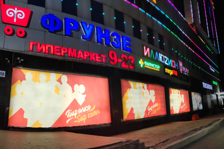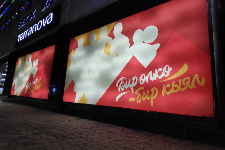 В Бишкеке появились баннеры красно-желтого цвета с надписью «Бир өлкө — бир кыял». На баннере изображены силуэты, но чьи — пока неизвестно.