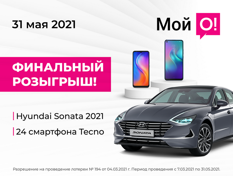 31 мая состоится финальный розыгрыш лотереи «Весенний драйв», где будет разыграно 24 смартфона Tecno и автомобиль Hyundai Sonata 2021.