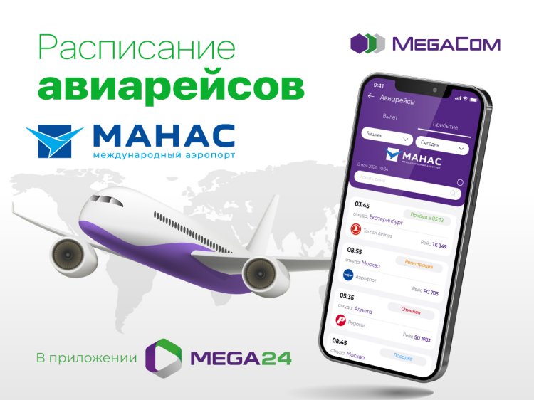 Теперь все пользователи MEGA24, в том числе и абоненты других мобильных операторов Кыргызской Республики, смогут просматривать онлайн-расписание авиарейсов международных аэропортов «Манас» и «Ош» в разделе «МегаПортал».