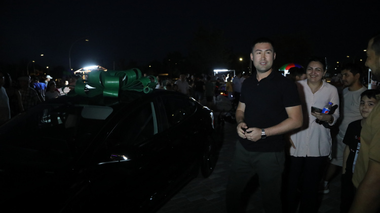 Торжественная церемония вручения заветных ключей от экологичного электромобиля Tesla Model 3 прошла вечером 16 июня в парке «Ынтымак-2».