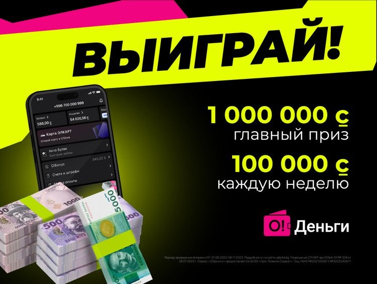 Каждую неделю будет разыграно 100 тысяч сомов: участники смогут выиграть 20 тысяч, 30 тысяч или 50 тысяч сомов. А в ноябре этого года будет разыгран главный приз — 1 миллион сомов!