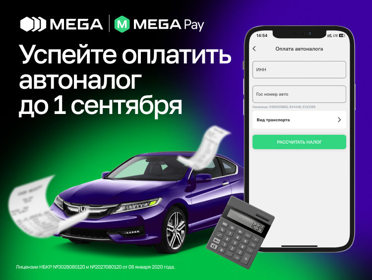 Оплата автоналога через мобильное приложение MegaPay займет всего несколько минут. Услуга доступна круглосуточно из любой локации. Напоминаем, что сумма налога рассчитывается в приложении автоматически.