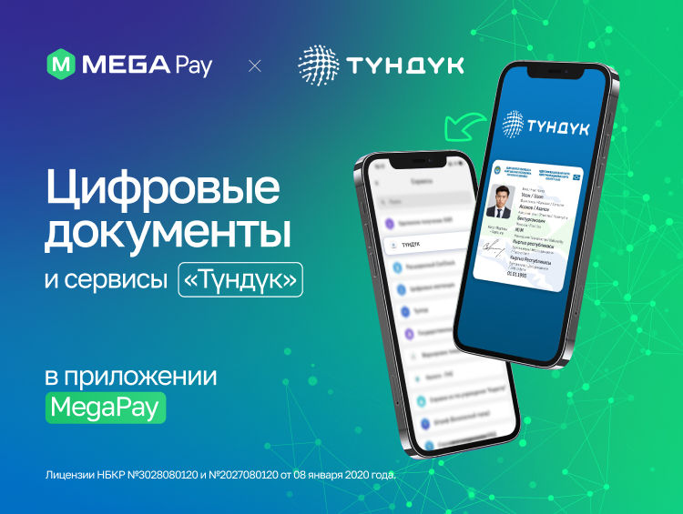 MEGA совместно с государственным учреждением «Түндүк» запустила новый пилотный проект. Теперь услуги и цифровые документы мобильного приложения «Түндүк» доступны в приложении MegaPay. Получить БЕСПЛАТНЫЙ доступ к цифровым документам и более 40 государственным услугам через MegaPay стало еще проще!