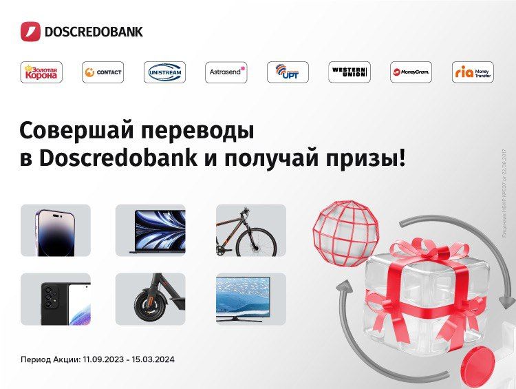 Doscredobank рад сообщить о старте акции по международным денежным переводам «Совершай переводы в Doscredobank и получай призы». В рамках нее клиенты банка, осуществляющие отправку или получение денежных переводов, могут стать обладателями крутых призов.