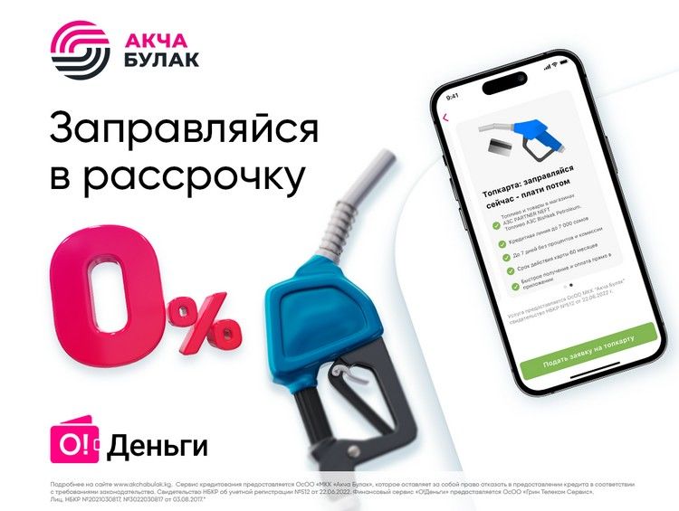Сервис кредитования предоставляется ОсОО «МКК «Акча Булак», которое оставляет за собой право отказать в предоставлении кредита в соответствии с требованиями законодательства. Свидетельство НБ КР об учетной регистрации № 512 от 22.06.2022. Финансовый сервис «О!Деньги» предоставляется ОсОО «Грин Телеком Сервис». Лиц. НБ КР № 2021030817, 3022030817 от 03.08.2017.