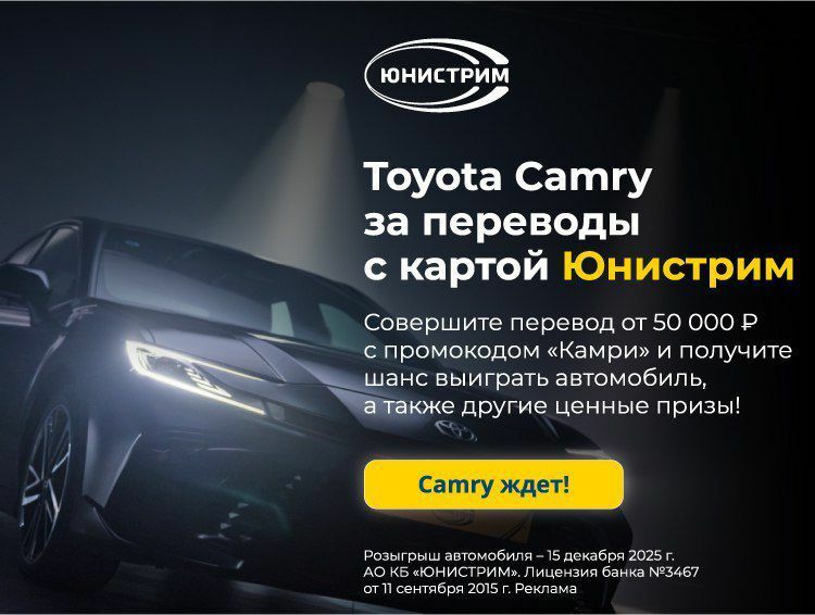 При этом переводы с карты позволят не только сэкономить, но и получить шанс победить в масштабном розыгрыше! До 15 декабря 2025 года банк проводит акцию «Camry за переводы с картой «Юнистрим».