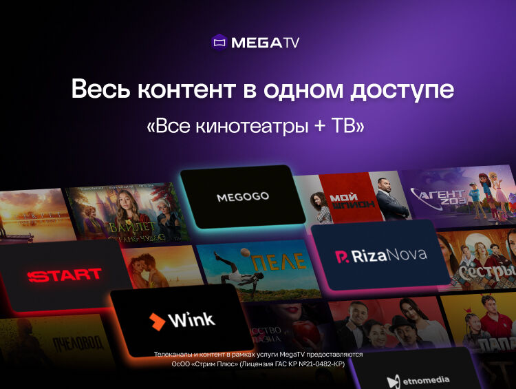 Пользователям открыт доступ к пяти популярным онлайн-кинотеатрам: «Этномедиа», Start, Wink, Megogo и RizaNova. В пакет также входит премиальный телевизионный набор MegaTV_Premium, включающий более 200 телеканалов в высоком качестве.