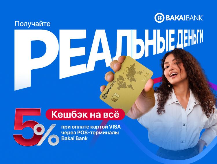 С 1 июля по 31 августа 2025 года держатели карт Visa от Bakai Bank получают 5 процентов кешбэка реальными деньгами от суммы каждой покупки при оплате через POS-терминалы Bakai Bank.