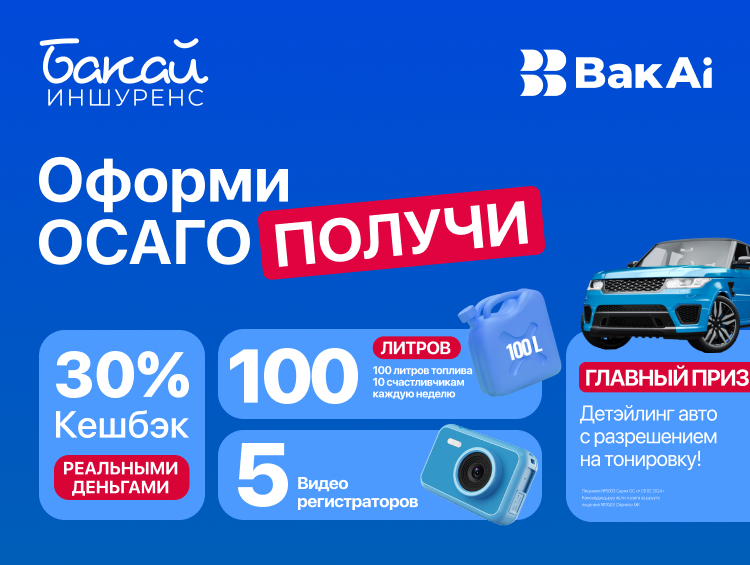 Оформи ОСАГО — заправься выгодой! Все клиенты, оформившие полис ОСАГО через приложение BakAi или в отделениях «Бакай Иншуренс», автоматически участвуют в розыгрыше ценных автомобильных призов.