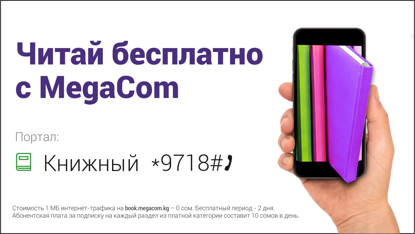 Оформите подписку на book.megacom.kg, набрав команду *9718#, и выбирайте любые интересующие вас книги из обширного каталога. Интернет-трафик в сети MegaСom при пользовании порталом совершенно бесплатный, оплачивается только подписка на платные разделы в размере 10 сомов в день (в том числе НДС и НсП).