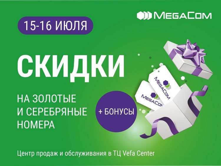 15—16 июля в Центре продаж и обслуживания MegaCom в ТЦ Vefa для всех желающих будет действовать скидка 50 процентов на номера категории «Золото» и «Серебро».