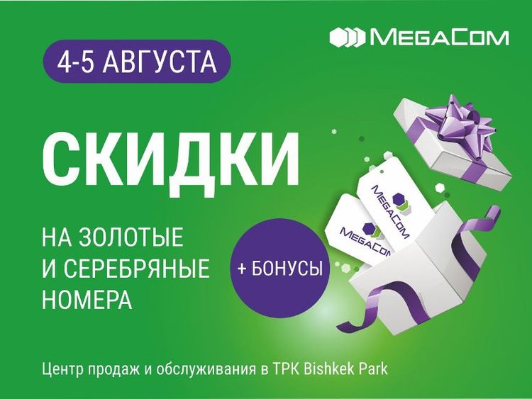 Мобильный оператор вновь подготовил приятный бонус для своих абонентов в рамках акции Shopping Fest в Центре продаж и обслуживания MegaCom, расположенном в торгово-развлекательном центре «Бишкек Парк». 4 и 5 августа с 10.00 до 1.00 будет действовать скидка 50 процентов на приобретение номеров категорий «серебро» и «золото».