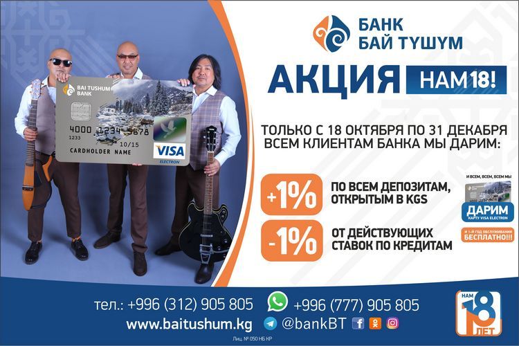 В честь своего 18-летия банк «Бай-Тушум» в самый разгар делового сезона проводит суперакцию и дарит бонусы по кредитам, депозитам и карточкам VISA.
