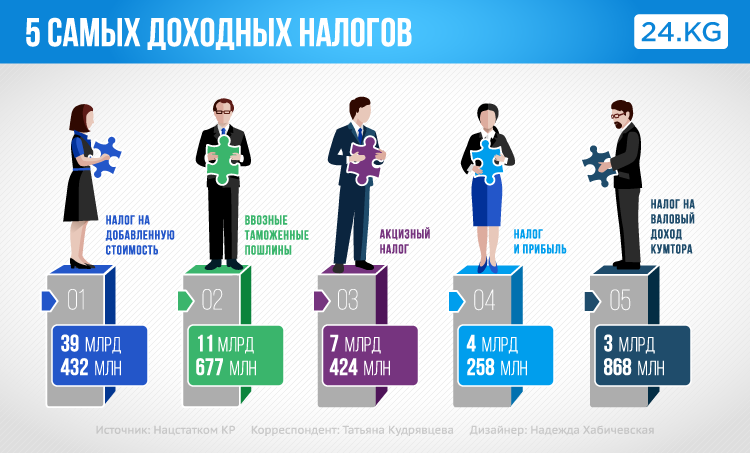 Главным источником пополнения казны стали налоговые доходы. Они принесли бюджету 75 миллиардов 485,2 миллиона сомов. В том числе Государственная налоговая служба собрала 44 миллиарда 444,6 миллиона сомов, таможня — 30 миллиардов 840,6 миллиона сомов.