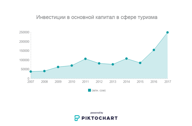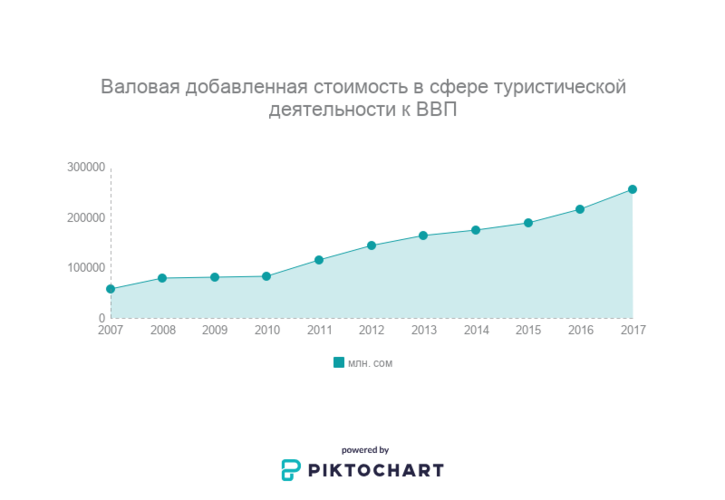 Доход от туризма 10 лет назад был около 5 миллиардов сомов, что составляло 4 процента от ВВП. А сейчас 25 миллиардов, но доля от ВВП все равно составляет около 5 процентов.«Кроме туризма, остальные отрасли тоже развиваются, поэтому в соотношении наша доля от ВВП колеблется от 4 до 5 процентов. Мы провели исследование в этом году и разработали стратегию, которая будет входить в программу правительства по развитию туризма до 2022 года. Мы ставим цель — довести долю туризма от ВВП до 10 процентов», — подчеркнули в департаменте туризма.