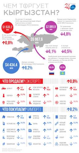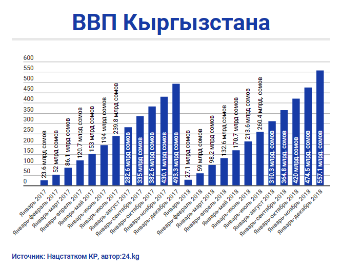 По итогам января — декабря 2018 года ВВП Кыргызстана достиг 557 миллиардов 113,3 миллиона сомов. По сравнению с 2017-м показатель вырос на 3,5 процента.