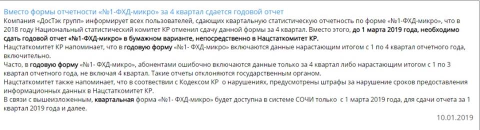 В подтверждение он привел сообщение компании DosTek group. Она уведомила клиентов о том, что они должны до 1 марта 2019 года сдать годовой отчет «№ 1-ФДХ-микро» (отчет об основных показателях деятельности малого предприятия) непосредственно в Нацстатком. Ведомство отменило сдачу отчета за четвертый квартал в электронном виде и требует годовой отчет.