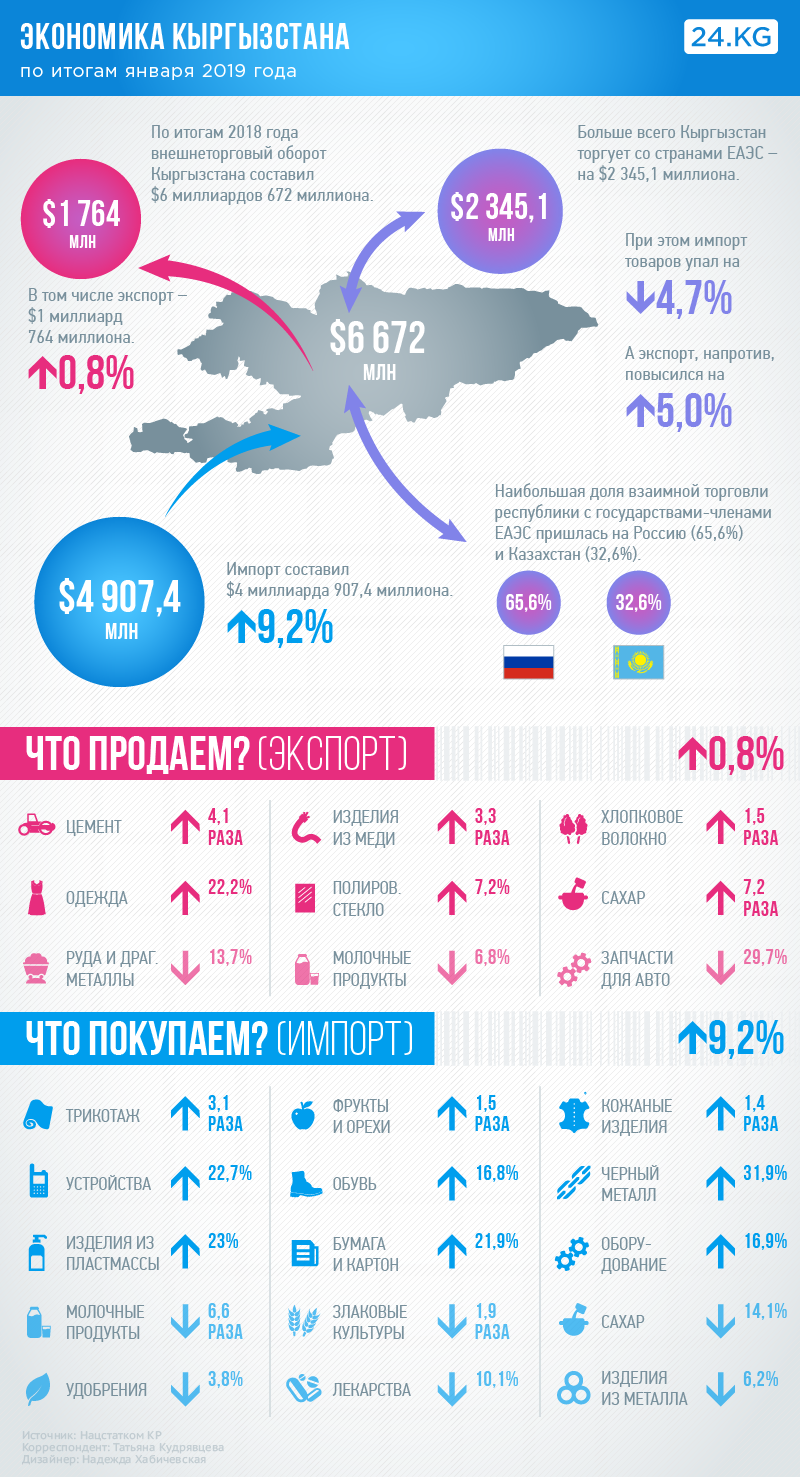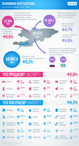 По данным Национального статистического комитета, ВВП Кыргызстана по итогам января 2019 года составил 30 миллиардов 243,4 миллиона сомов. Это на 6,4 процента больше показателя января 2018-го.