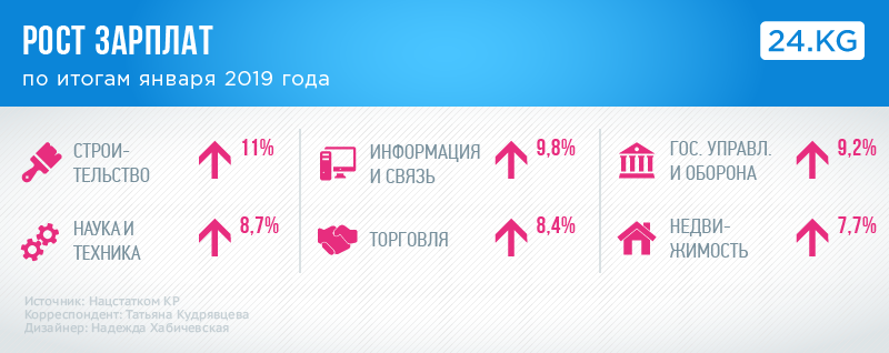 Наиболее значительное повышение среднемесячной заработной платы в строительстве (11 процентов), сфере информации и связи (9,8 процента), государственного управления и обороны, обязательного социального обеспечения (9,2 процента), профессиональной, научной и технической деятельности (8,7 процента), оптовой и розничной торговли, ремонта автомобилей и мотоциклов (8,4 процента), операций с недвижимым имуществом (7,7 процента).