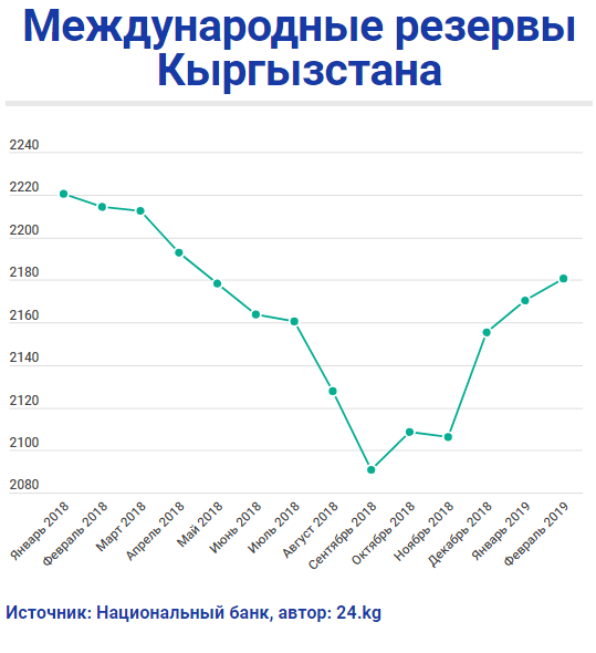 Нацбанк использует резервы для сглаживания резких колебаний на валютном рынке. Всего в прошлом году НБ КР провел 11 интервенций, купив $20 миллионов 550 тысяч и продав $154 миллиона 550 тысяч. Чистая продажа долларов с начала 2018-го составила $134 миллиона. В январе 2019 года финансовый регулятор только раз выходил на валютный рынок, продав $18,8 миллиона.