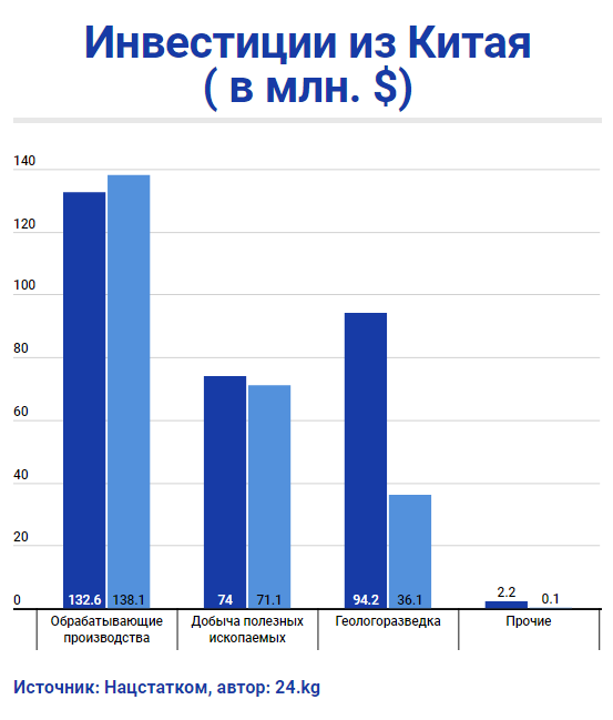 Основная часть инвестиций из КНР направлена в предприятия обрабатывающих производств (более 56 процентов), добычи полезных ископаемых (29 процентов) и геологоразведку (около 15 процентов).