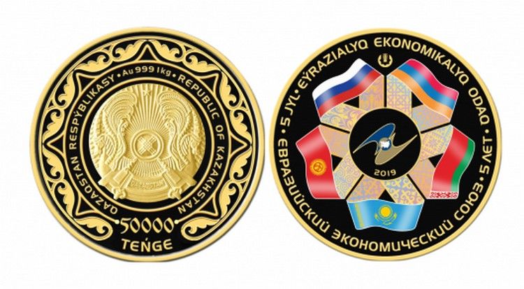 Национальный банк Казахстана выпустил коллекционные монеты «Евразийский экономический союз. 5 лет» из золота номиналом 50 тысяч и 500 тенге и из серебра номиналом 500 тенге. Об этом сообщило агентство Tengrinews.kz.
