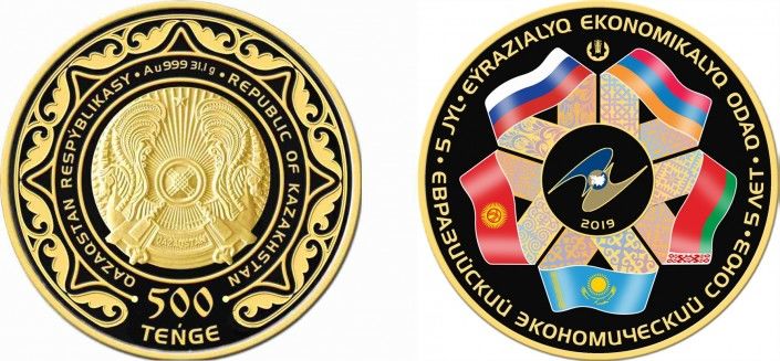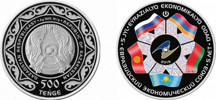 Монеты приурочены к пятилетию со дня создания Евразийского экономического союза. На их лицевой стороне (аверсе) в центре изображен герб Казахстана. По окружности соответствующие им номиналы, надписи QAZAQSTAN RESPÝBLIKASY и REPUBLIC OF KAZAKHSTAN и надписи, обозначающие металл, из которого изготовлены монеты, их пробу и массу.На оборотной стороне (реверсе) монет в центральной части официальная эмблема Евразийского экономического союза и число «2019», обозначающее год чеканки. Вокруг эмблемы композиция из ленточных орнаментов и государственных флагов стран Евразийского экономического союза.