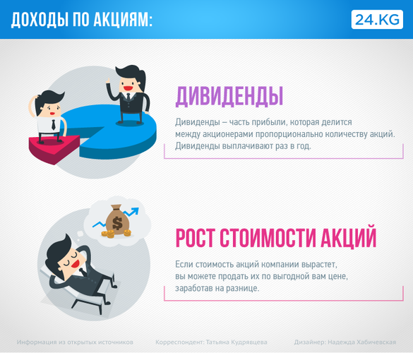 Тут все просто. Покупка акций — один из вариантов вложения денег, доступный в Кыргызстане. Покупая акции, вы можете рассчитывать на два вида дохода: дивиденды и рост стоимости акций.