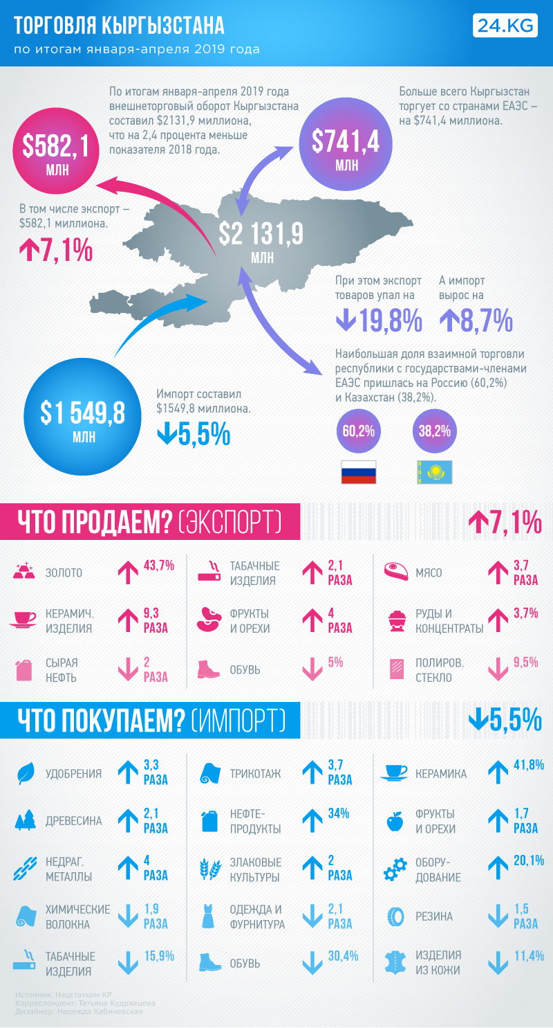 По итогам января — мая 2019 года ВВП Кыргызстана составил 183 миллиарда 750 миллионов сомов. По сравнению с 2018-м он вырос на 5,6 процента.