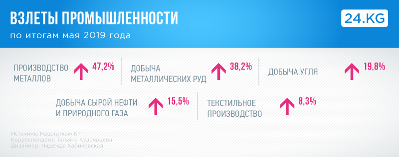 Зависимость экономики от добычи золота хорошо видна на развитии промышленности. После прошлогоднего оглушительного падения в этом году показатели немного радуют. Так, по итогам января — мая 2019 года в Кыргызстане произведено промышленной продукции на 104 миллиарда 29,1 миллиона сомов. Это на 17 процентов больше, чем в 2018-м.